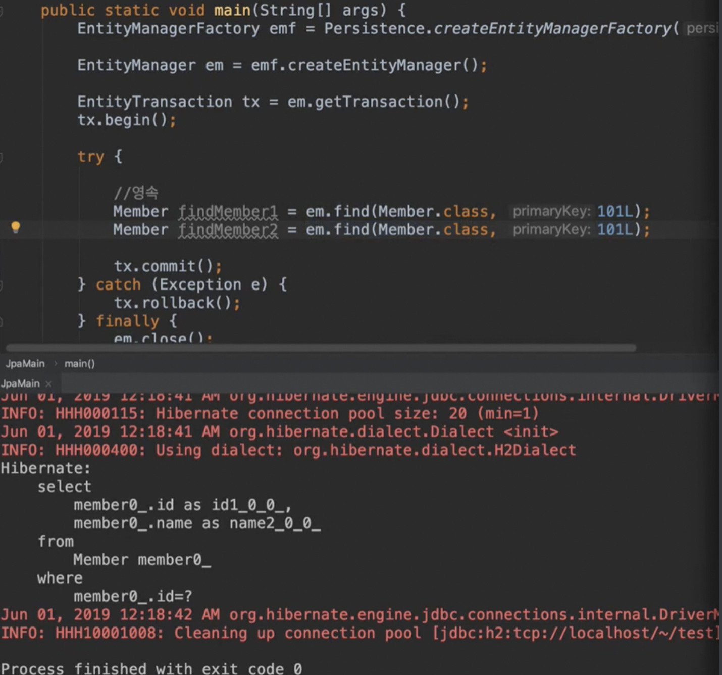아래 코드를 실행하면 EntityManager을 통해 영속성컨텍스트가 생성이 됩나다. (entityManager) 내부에는 1차캐시를 들고있습니다.