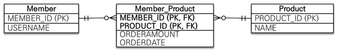 하지만, 관계형 데이터베이스는 정규화된 테이블 2개로 다대다 관계를 표현할 수 없다.
