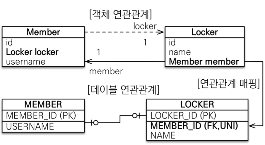 @Entity public class Member{ @Id @GeneratedValue @Column(name= "MEMBER_ID") private long id; @OneToOne(mappedBy = "member") private Locker locker;- Member.java 테이블의 일부