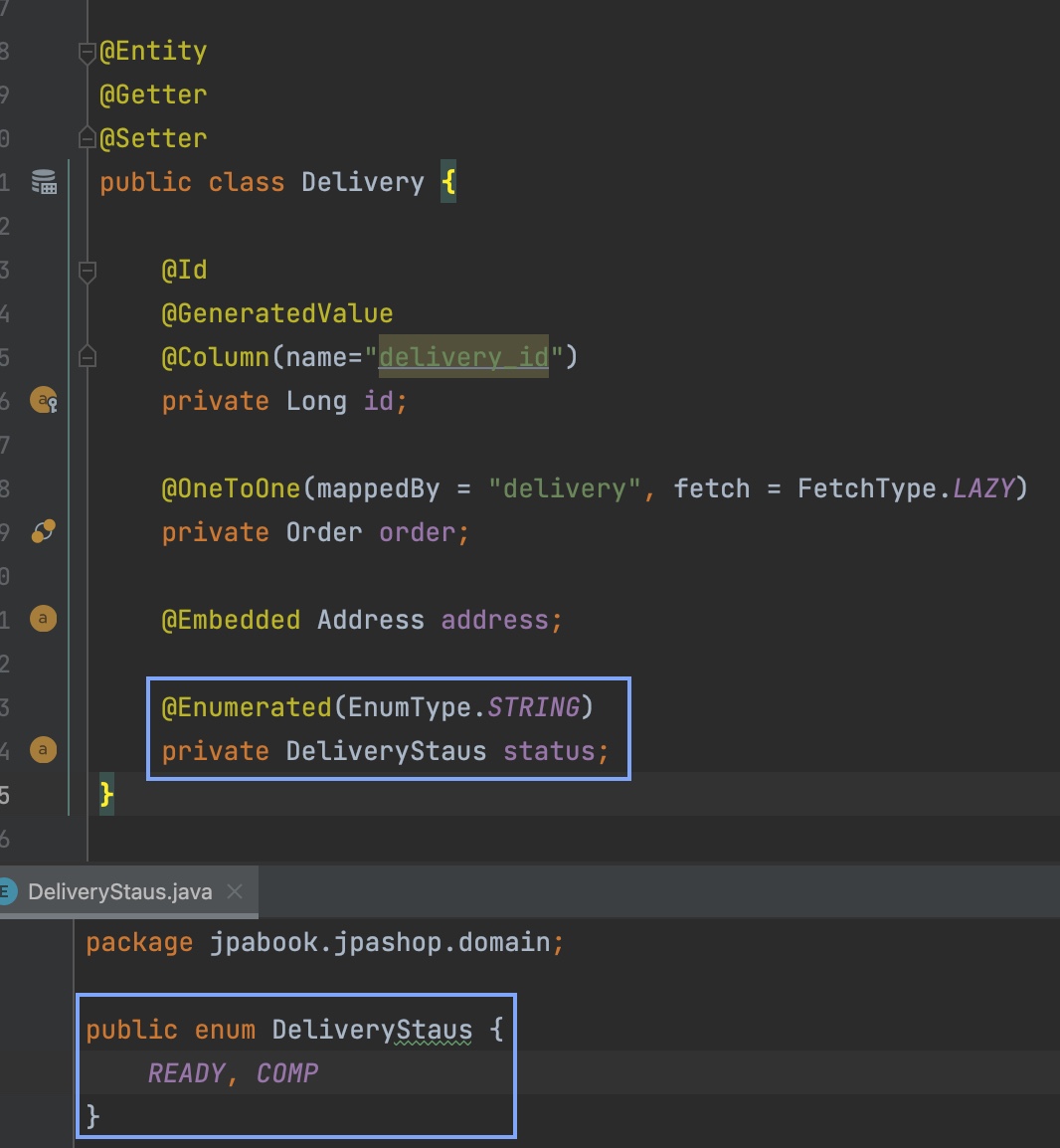 주소(Address): 값 타입(임베디드 타입)이다. 회원과 배송(Delivery)에서 사용한다.