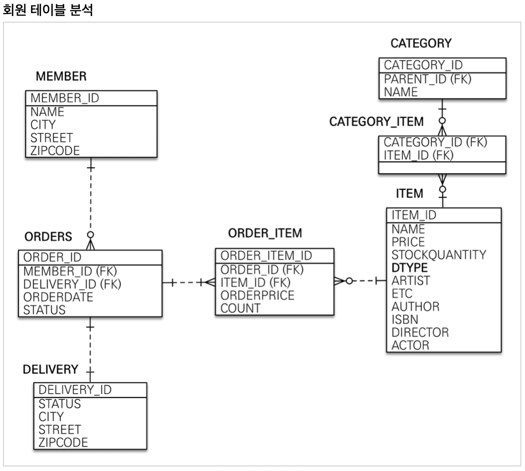 회원**(Member):** 이름과 임베디드 타입인 주소( Address ), 그리고 주문( orders ) 리스트를 가진다.