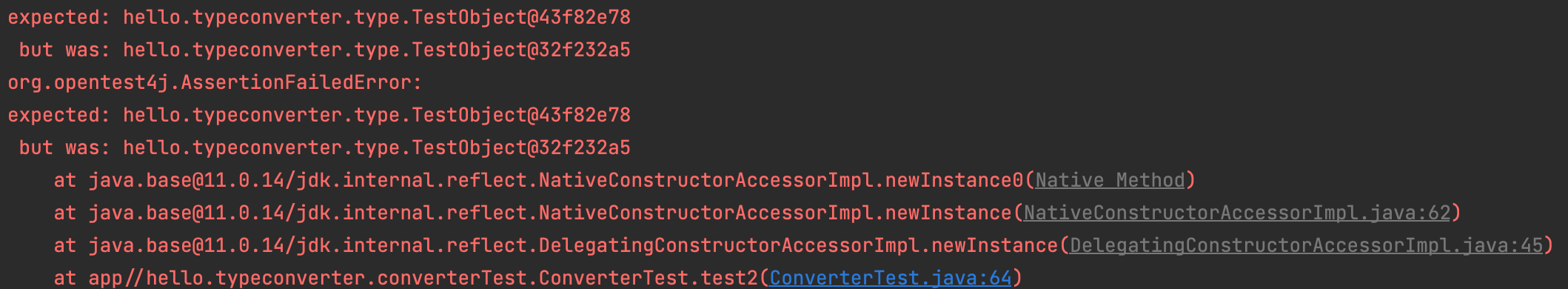 그렇기에 TestObject가 같지 않다고 Exception이 발생하는 것이다.