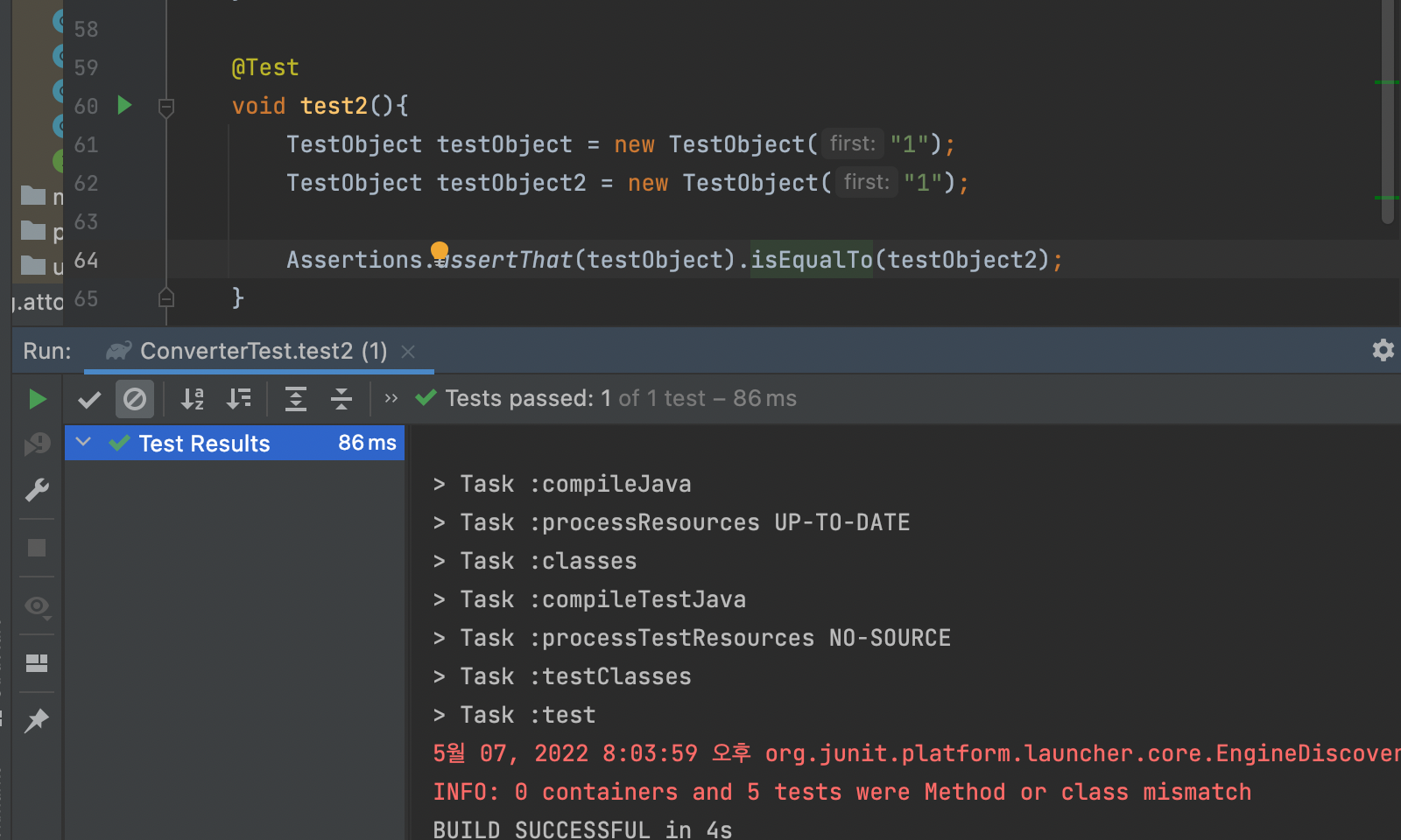 Assertions.assertThat(testObject).isEqualTo(testObject2);