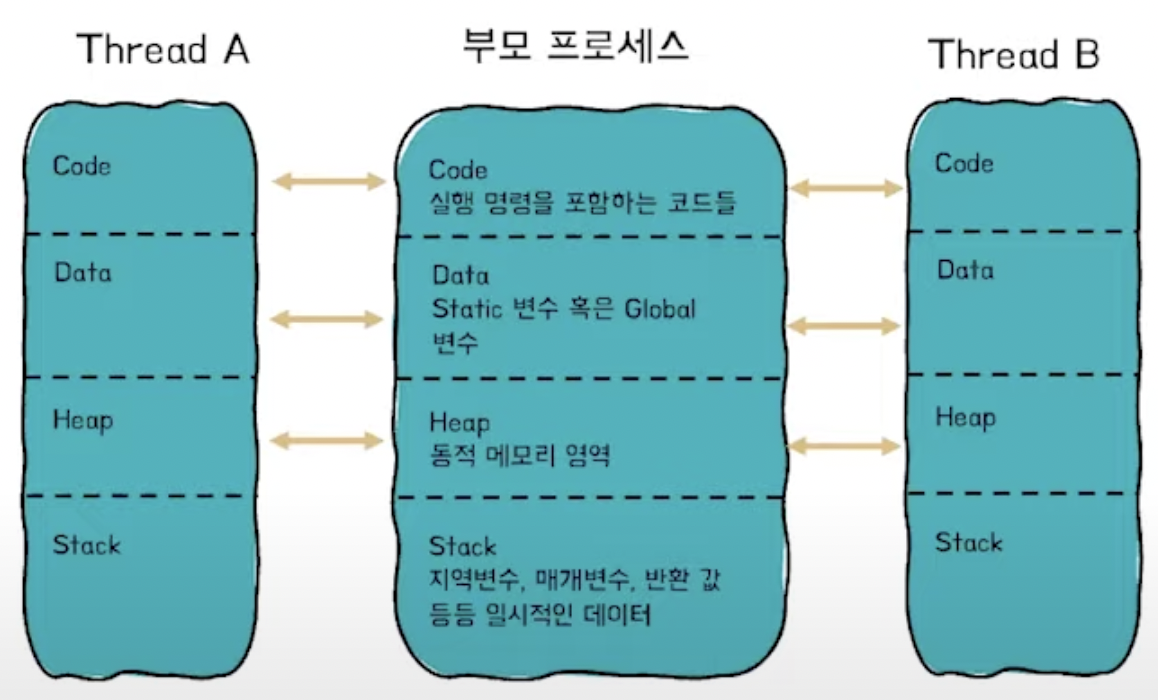 | 각 프로세스는 RAM 메모리를 독립적 | 하나의 프로세스로 Code, Data, Heap영역이 공유되며 각 Stack영역이 이루어져, Threa가 긴밀하게 연결되어있다. |