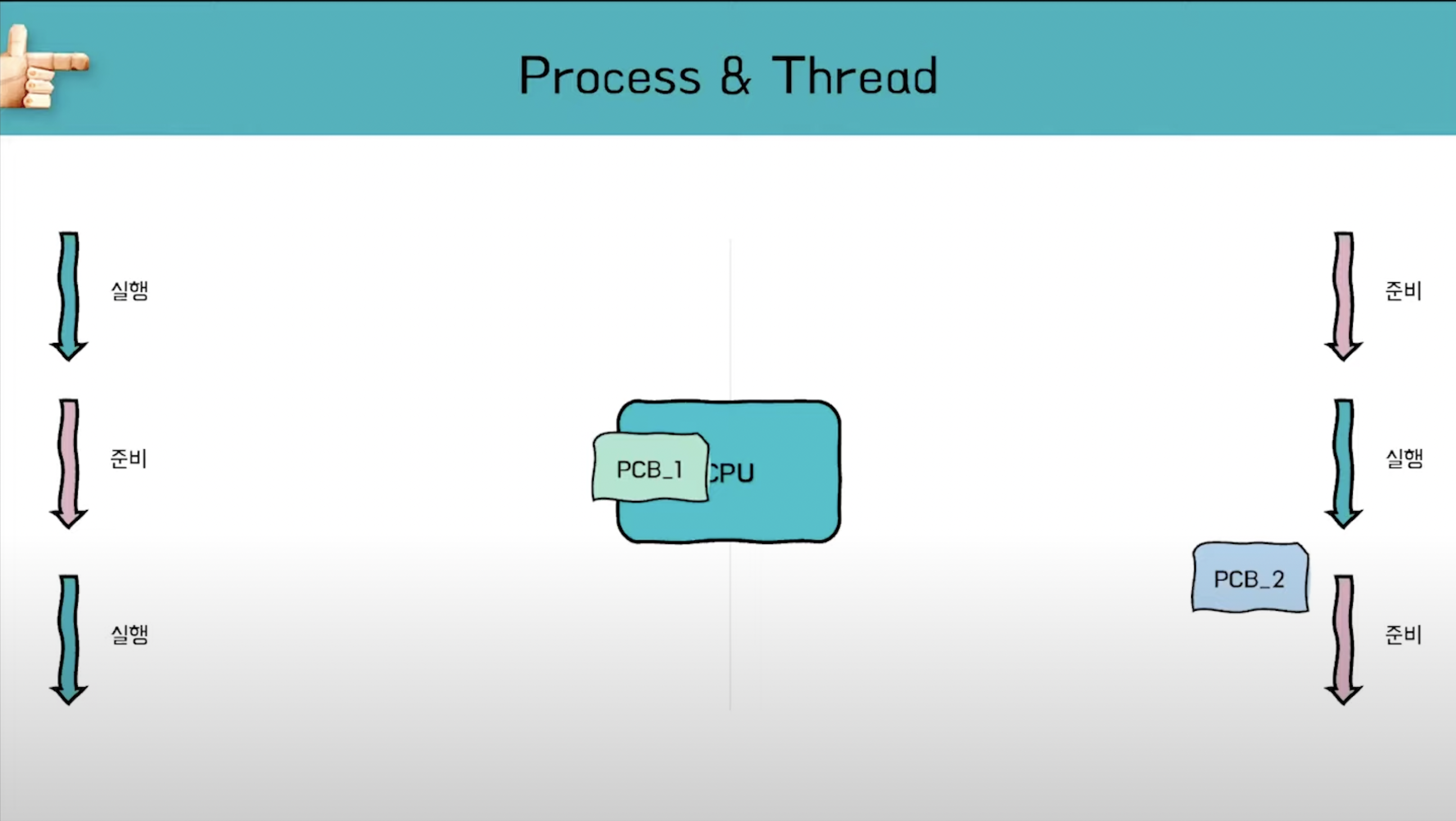 [PCB_1]와 [PCB_2]가 Context Switching이 반복되면서 CPU에 적재되었다가 내려가고있습니다.
