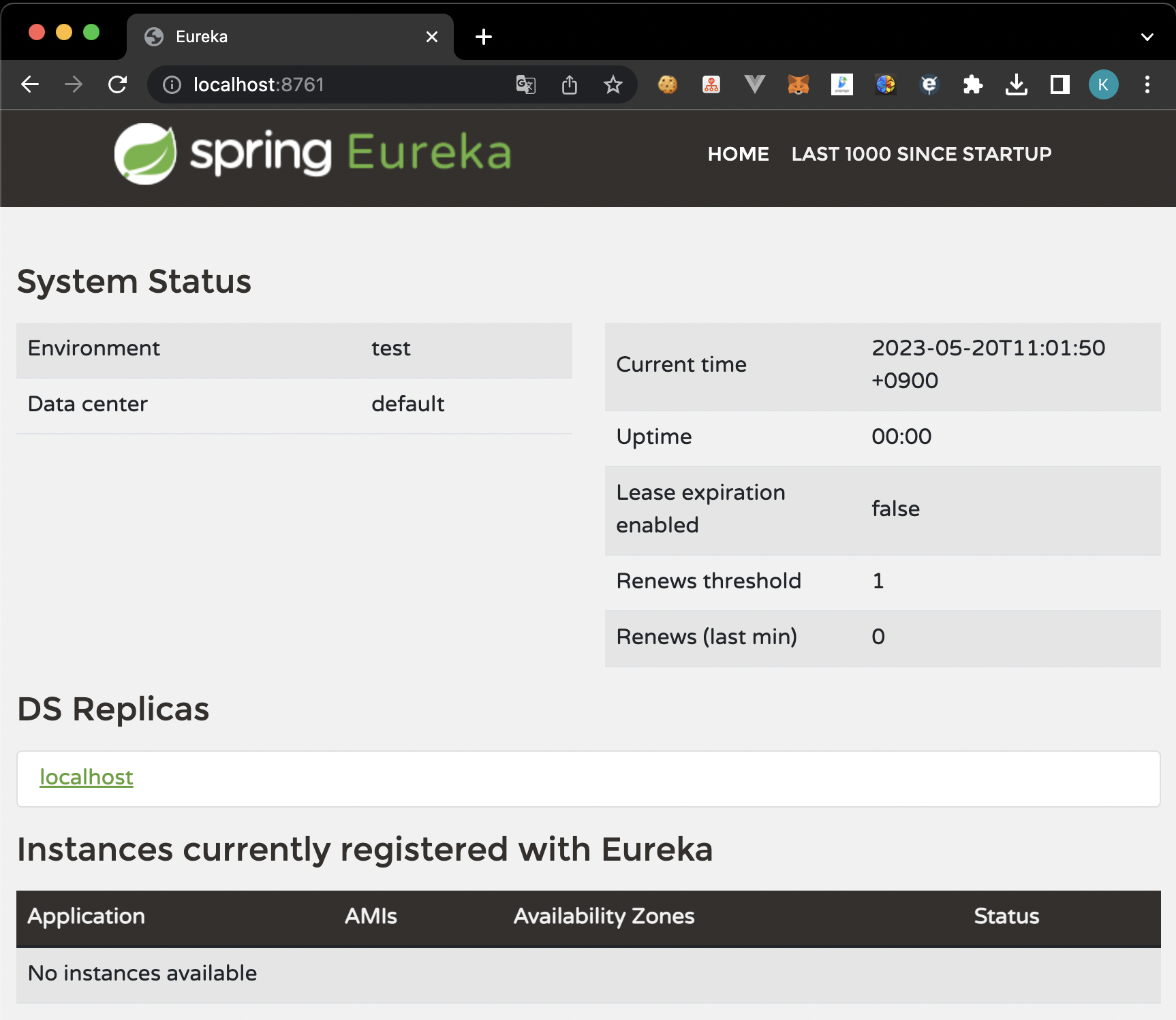 이렇게 EUREKA 서버를 등록하고 난후, EUREKA 서버로 들어가보면 EUREKA SERVICE가 등록됨을 확인할 수 있다.