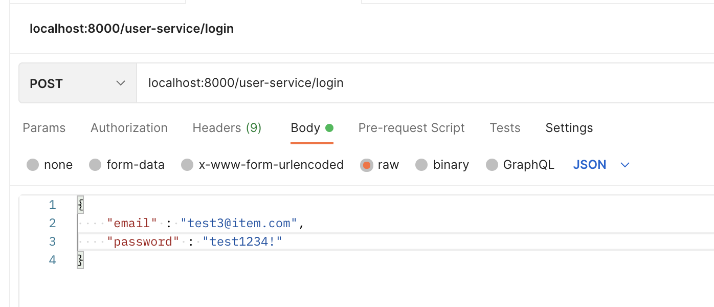 2. /user-service/login 으로 POST 데이터를 날려본다
