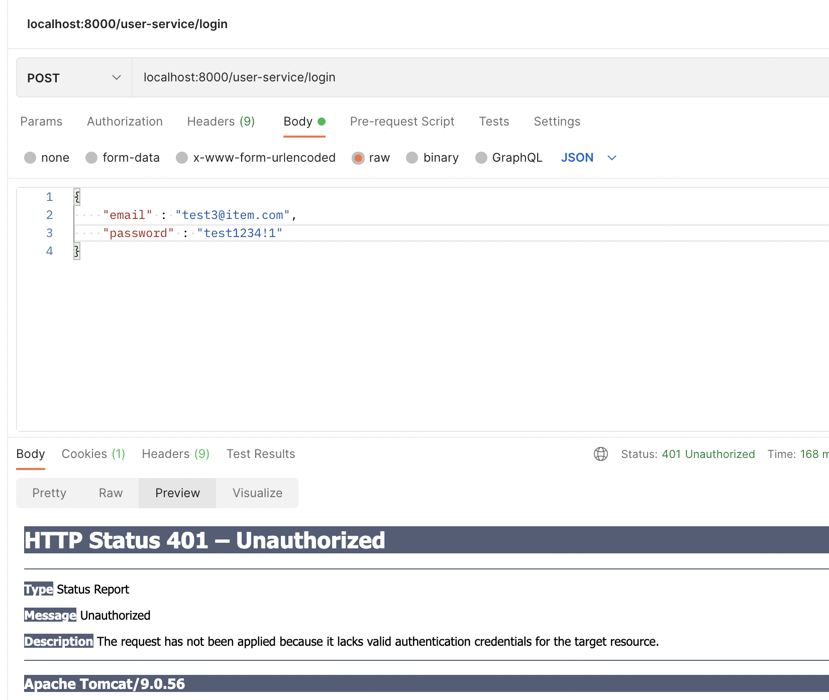 그리고 이메일을 혹은 비밀번호를 틀리게하여 로그인하면 아래와같이 401 - Unauthorized 가 표시된다