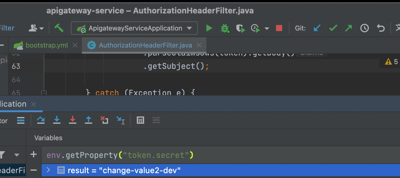 재기동 시 각각 apigateway - token.secret 값은 ecommerce-dev.yml 파일을