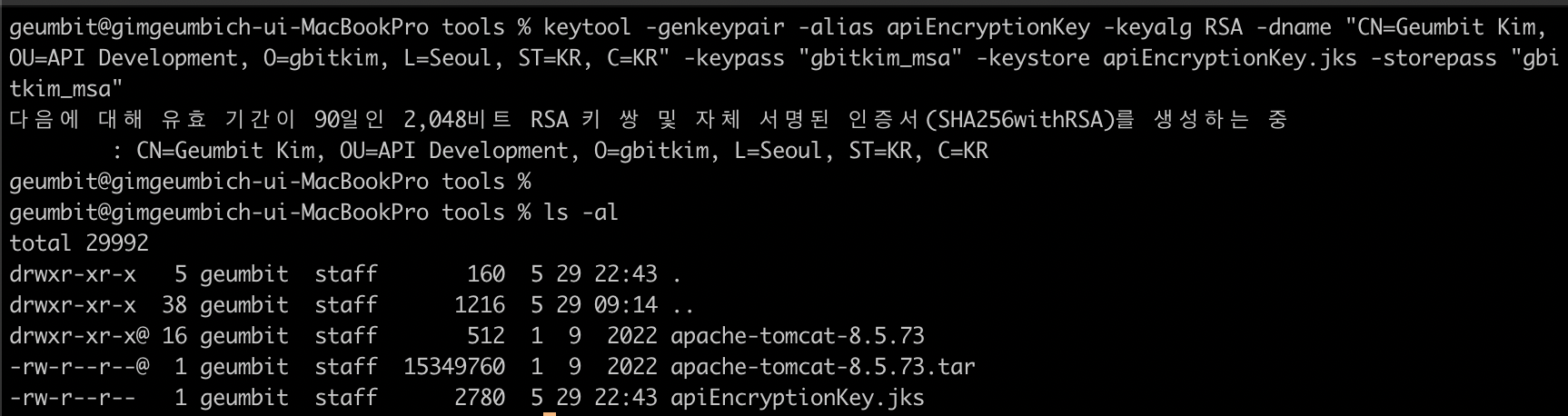 keytool -genkeypair -alias apiEncryptionKey -keyalg RSA -dname "CN=Geumbit Kim, OU=API Development, O=gbitkim, L=Seoul, ST=KR, C=KR" -keypass "gbitkim_msa" -keystore apiEncryptionKey.jks -storepass "gbitkim_msa"