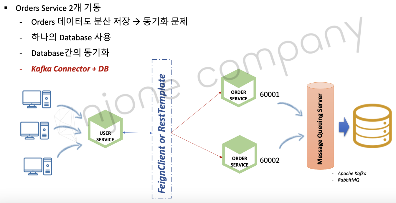 OrderService를 여러개 띄우면서 하나의 DB에 데이터 저장 시 동기화문제가 생길 수 있다. 그렇기에 Message Queuing Server(Kafka)를 사용하여 미들웨어를 넣고 데이터를 동기화 시킨다.