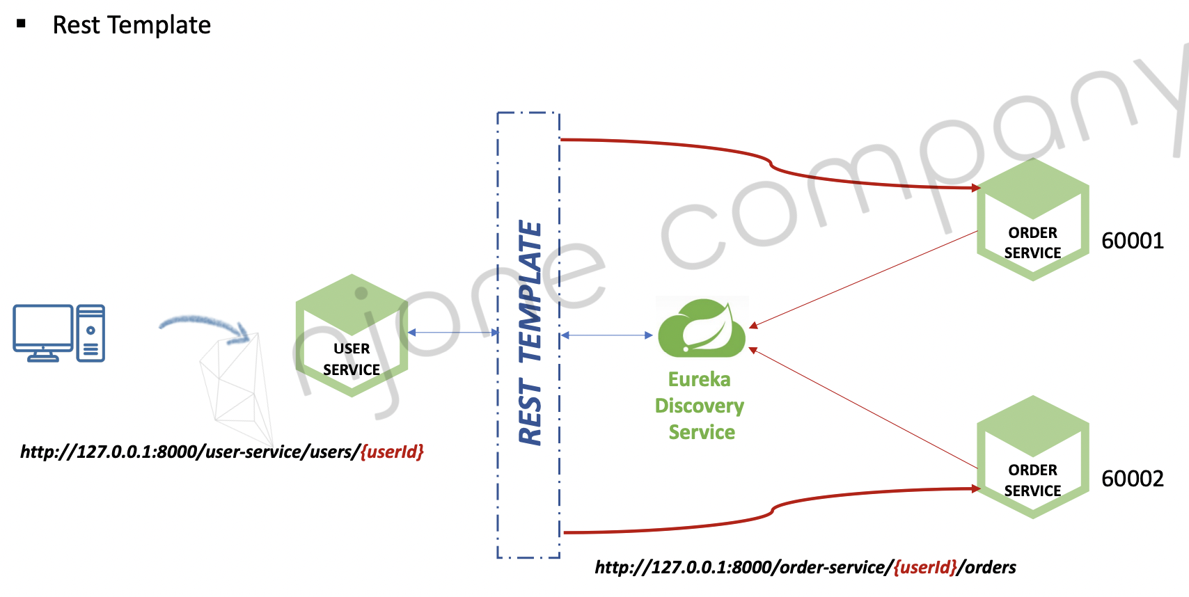 REST Template를 통하여 USER Service가 Order Service에게 요청 하고 응답을 받는다