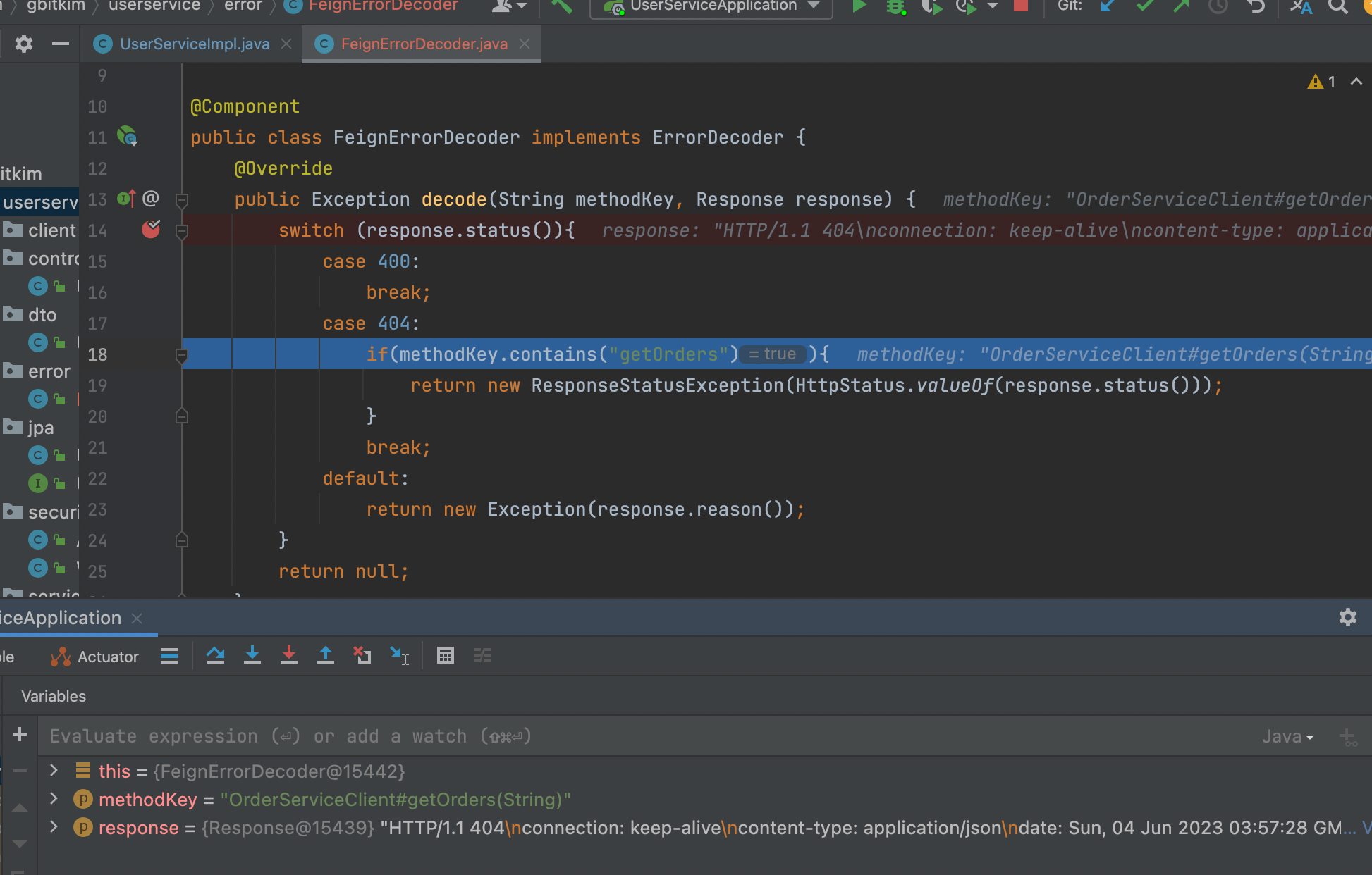 getOrders 는 없는 order-service의 url을 요청하기에 다음과 같이 FeignException이 발생하고 이를