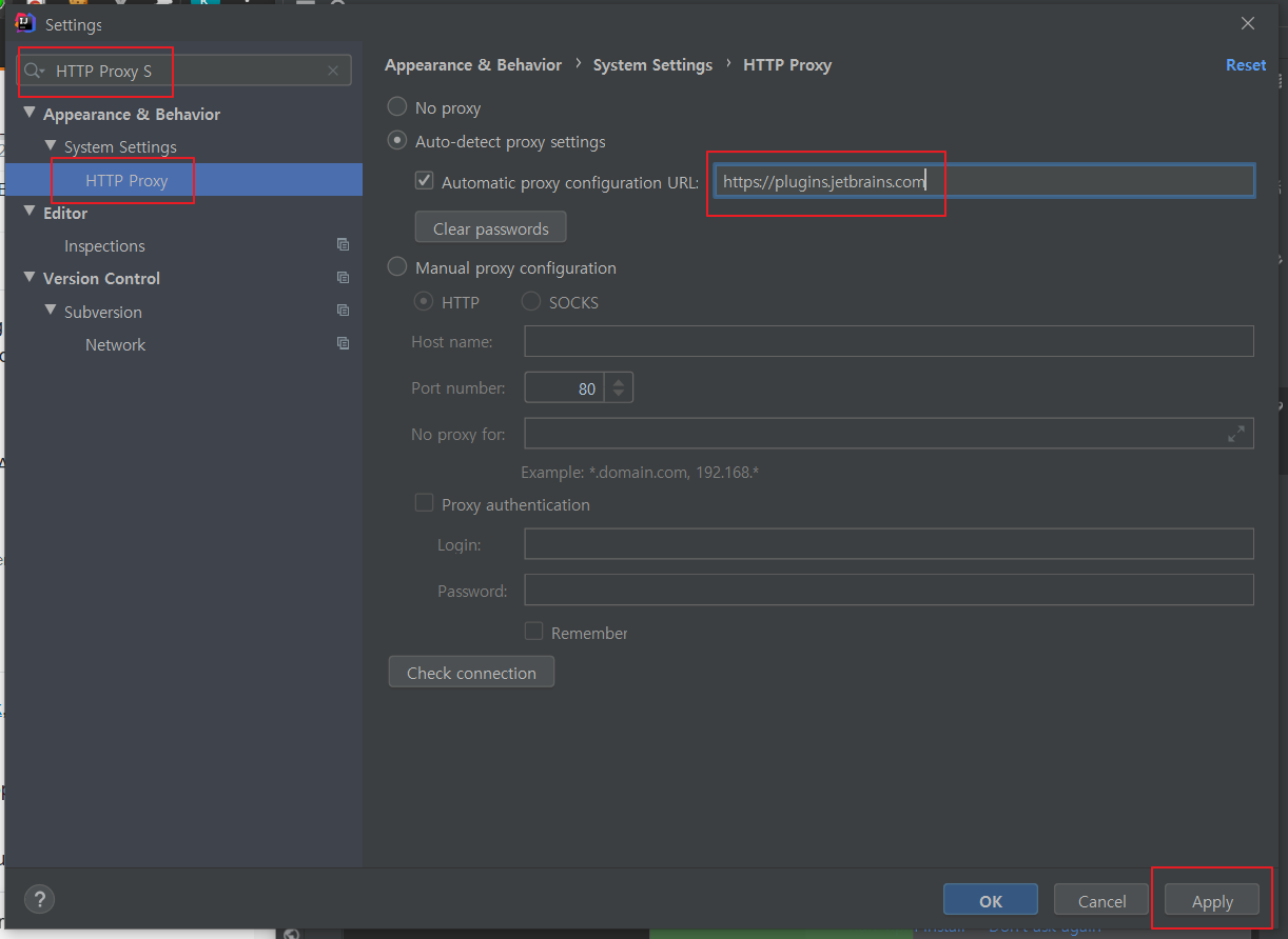 **Settings > Appearance & Behavior > System Settings > HTTP Proxy**