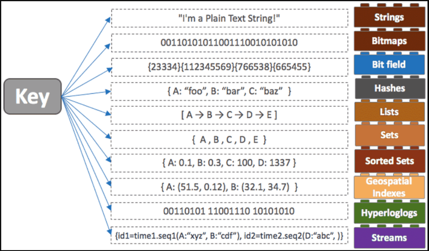 redis 는 아래 그림과 같이 key-value 형태로 데이터를 저장됩니다. 여기서 value는 아래와 같은 다양한 Type들이 들어옵니다. * String, Bitmap, Hash, List, Set, Sorted Set, Geospatial Index, Hyperloglog, Stream